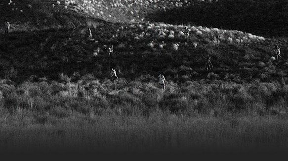 But then, when the film shows the photo in more detail, something chilling emerges. The tree at the top of the hill is revealed to be a sprinting human figure. It's a shocking sight. But then the photo becomes slowly, horribly clear. The dozens of dots that scatter the harmless landscape are not, as we thought, sticks and trees.