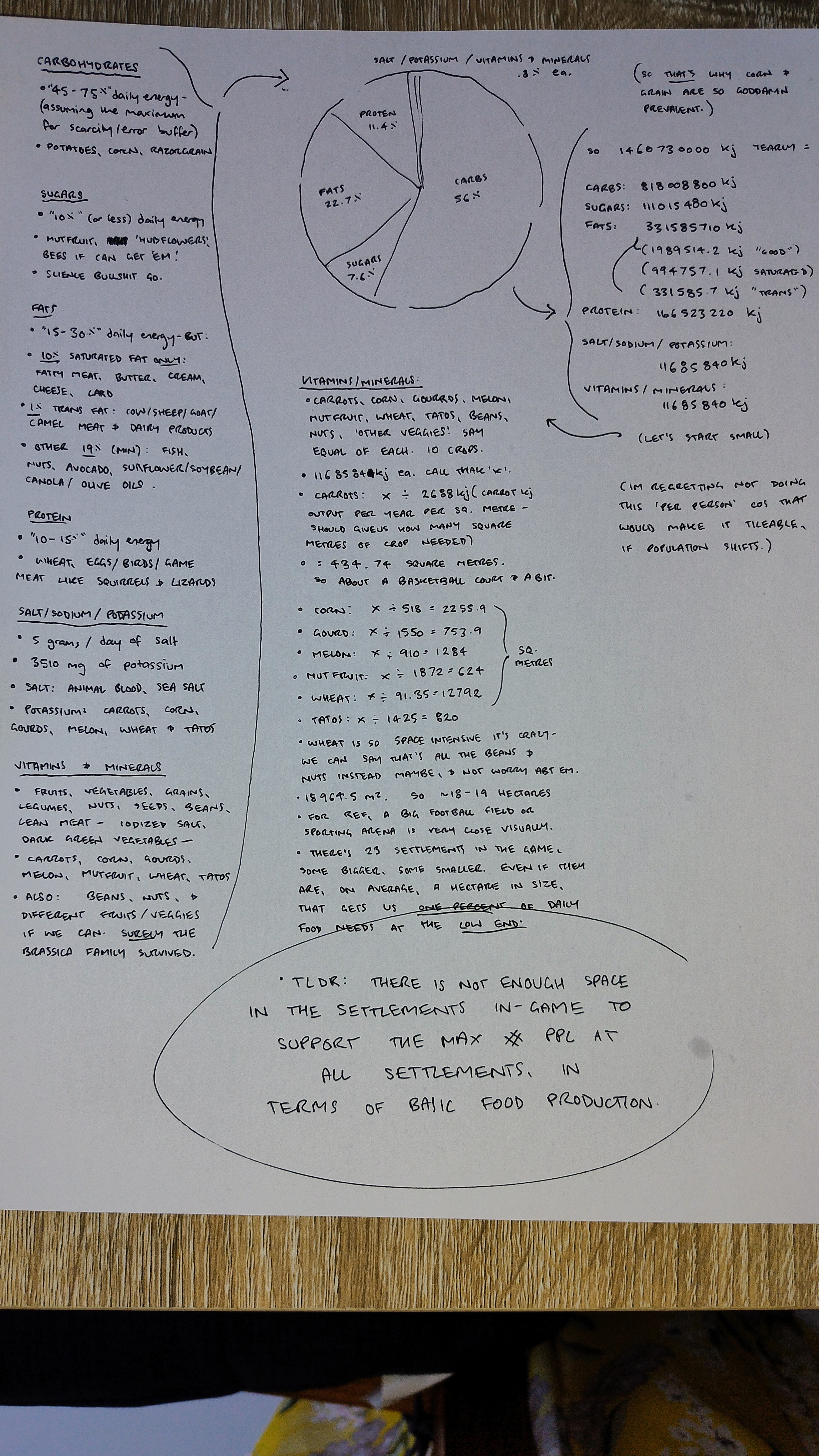Okay. I'm gonna do a bunch more maths to work out how many kj per person per year. We're having to start over a little bit, but that's fine. Then I'll get the exact amount of crop space each person needs for that amount of energy. And then we'll know exactly how much room we need for the stuff we need to grow, with tileable calculations. God. What's even the point, you know?