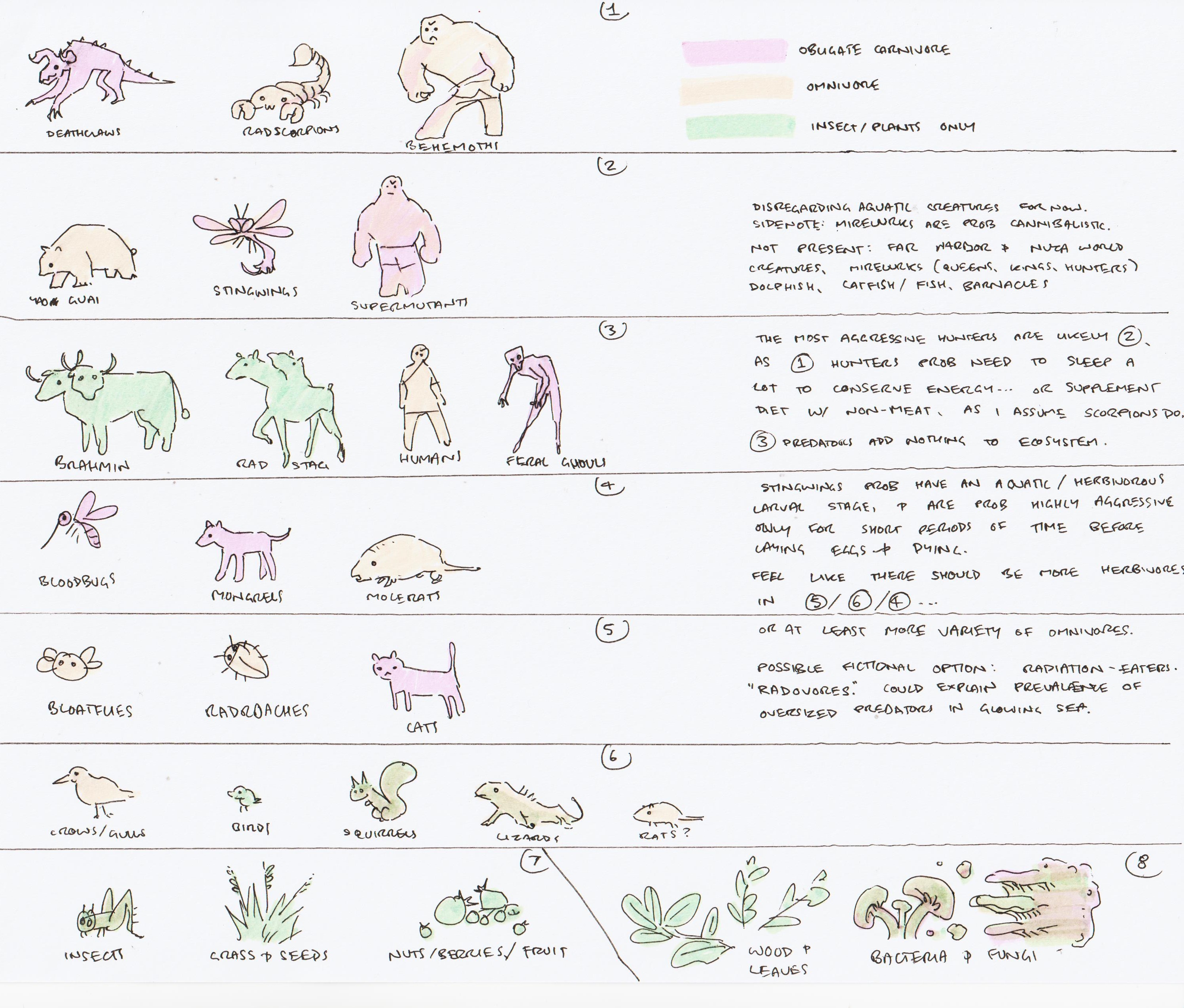 Lateral expansion: up and down. Hunting parties into the glowing sea. Experimentation - science bullshit go. Raiders more akin to bandits, aka remnants of a war, a soldier force shattered. Minutemen 'bad' groups. Fake 'radovore' animals and plants. Skyscraper-esque complexes, maybe more or less open to the elements?