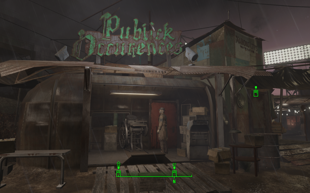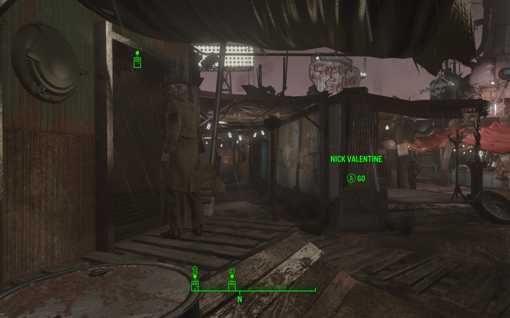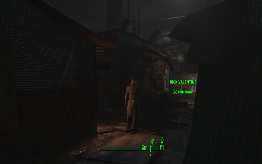 Nick Valentine watched the rain sluice down the gutters of Diamond City. It was a rough gem, this city. She'd just as easy leave you in the cold as take you into her arms. But he had it good. Real good. The Public Occurrences sign blinked on and off in the downpour, and he pulled a lit cigarette to his lips. He'd stepped outside for just a moment - hadn't wanted to smoke with Gnat in the room.